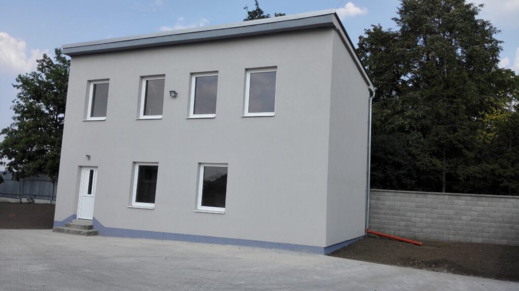 V areálu jsme provedli demolici a likvidaci původních nevyhovujících výrobních staveb, výstavbu nové skladové haly, nové sociální zázemí, šatny, WC, opravu správní budovy, kompletní výměnu veškerých výplní, kompletní nové střešní plechové krytiny, úpravy betonových ploch, srovnání terénů včetně osetí.