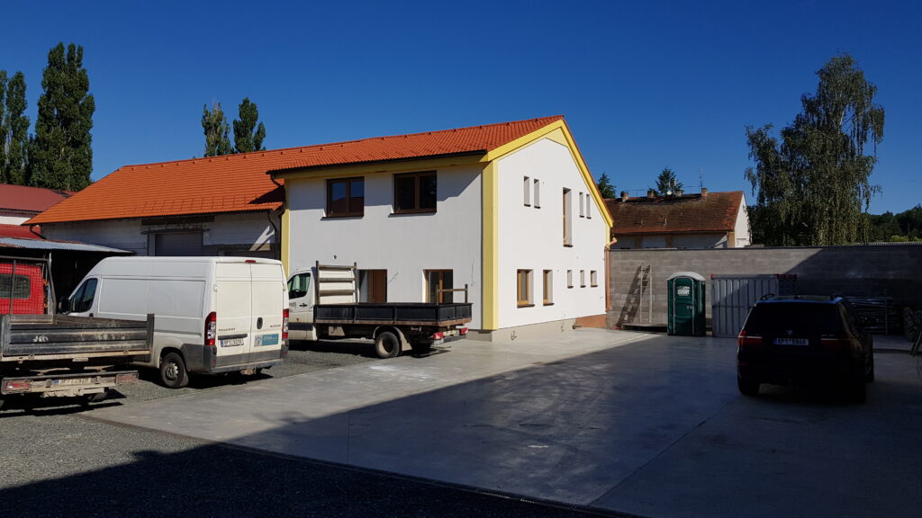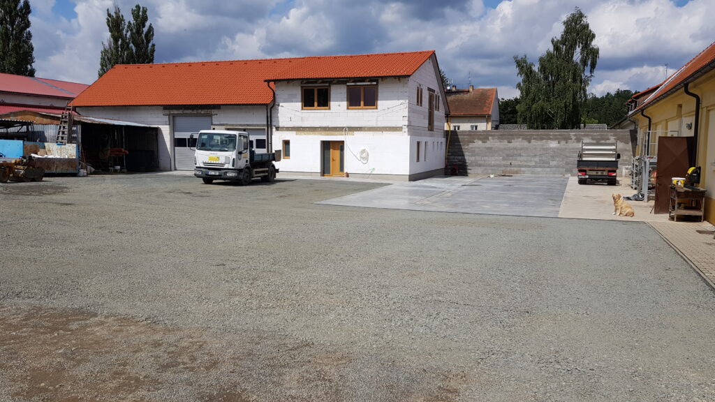 Disponujeme více jak 100 paletovými místy ve skladovací hale pro uskladnění veškerého potřebného materiálu, což nám umožňuje mít vše potřebné po ruce. Do příštích let plánujeme výstavbu poslední haly a venkovní plochy vyasfaltovat.